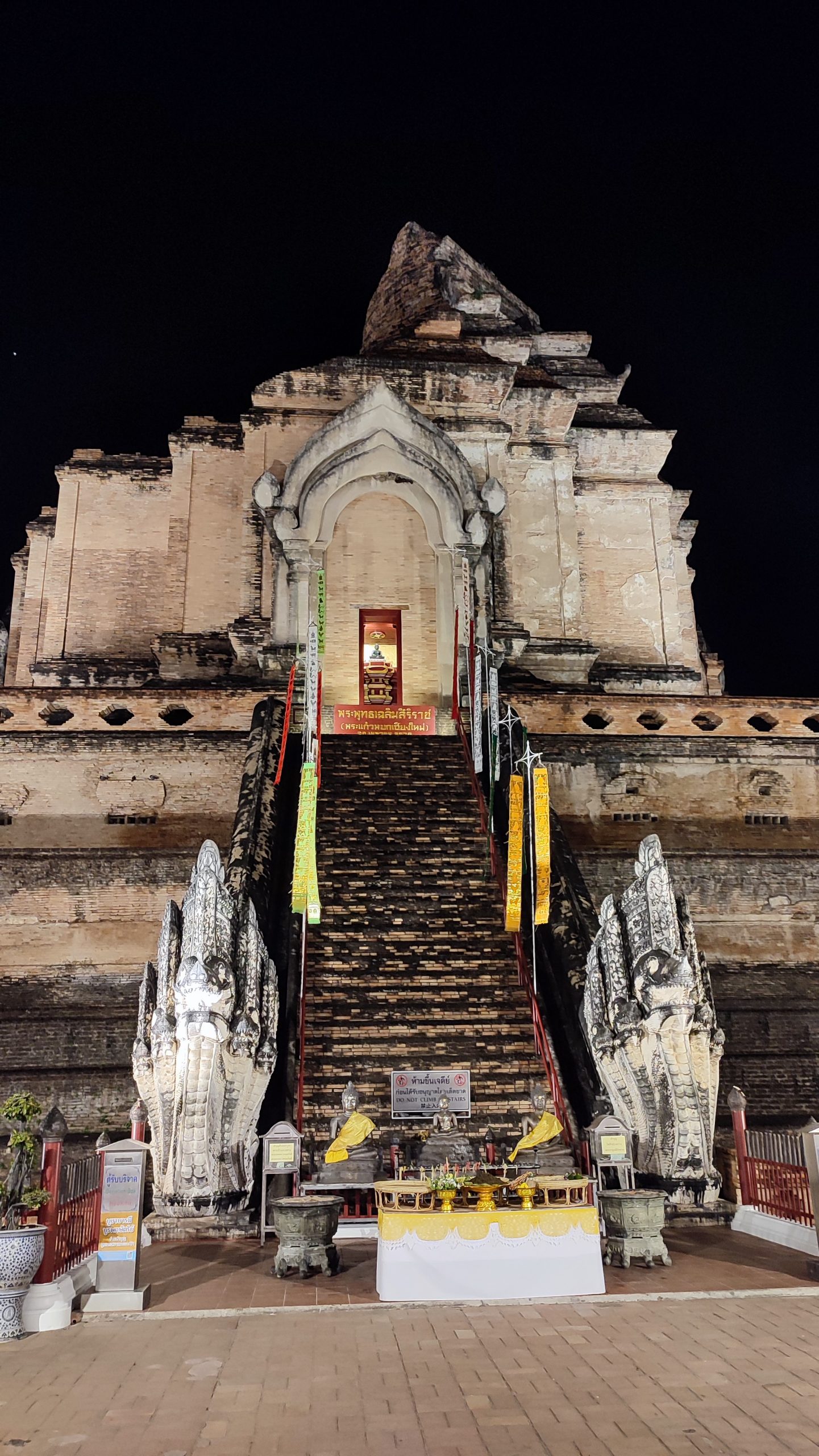 Nach einer Viertelstunde haben wir das Geschehen dann doch verlassen und sind um einen alten Tempel herumgelaufen, der auch noch auf dem Gelände stand. Er war ein bisschen aufgebaut wie eine stufenförmige Pyramide. Auf jeder Seite gab es eine große „Treppe“, wobei diese nur auf einer Seite Stufen hatte, die anderen müsste man also eher als Rampen bezeichnen. Die Treppe führte zu einem großen Bogen im Tempel, worin (natürlich) ein goldener Buddha saß. An den Seitenwänden der „Pyramide“ konnte man die Überreste von Steinelefanten sehen, die einmal um das ganze Gebäude herumgeführt haben müssen. Auch an der Spitze war vieles abgebrochen, doch das hat den Tempel nicht weniger beeindruckend gemacht! Der Bau hat schon im 14. Jahrhundert begonnen und es ist einfach schön zu sehen, dass manche von solch alten Bauwerken es bis in die heutige Zeit geschafft haben, trotz all der Unwetter und Kriege, die seitdem schon auf diesem Planeten gewütet haben.