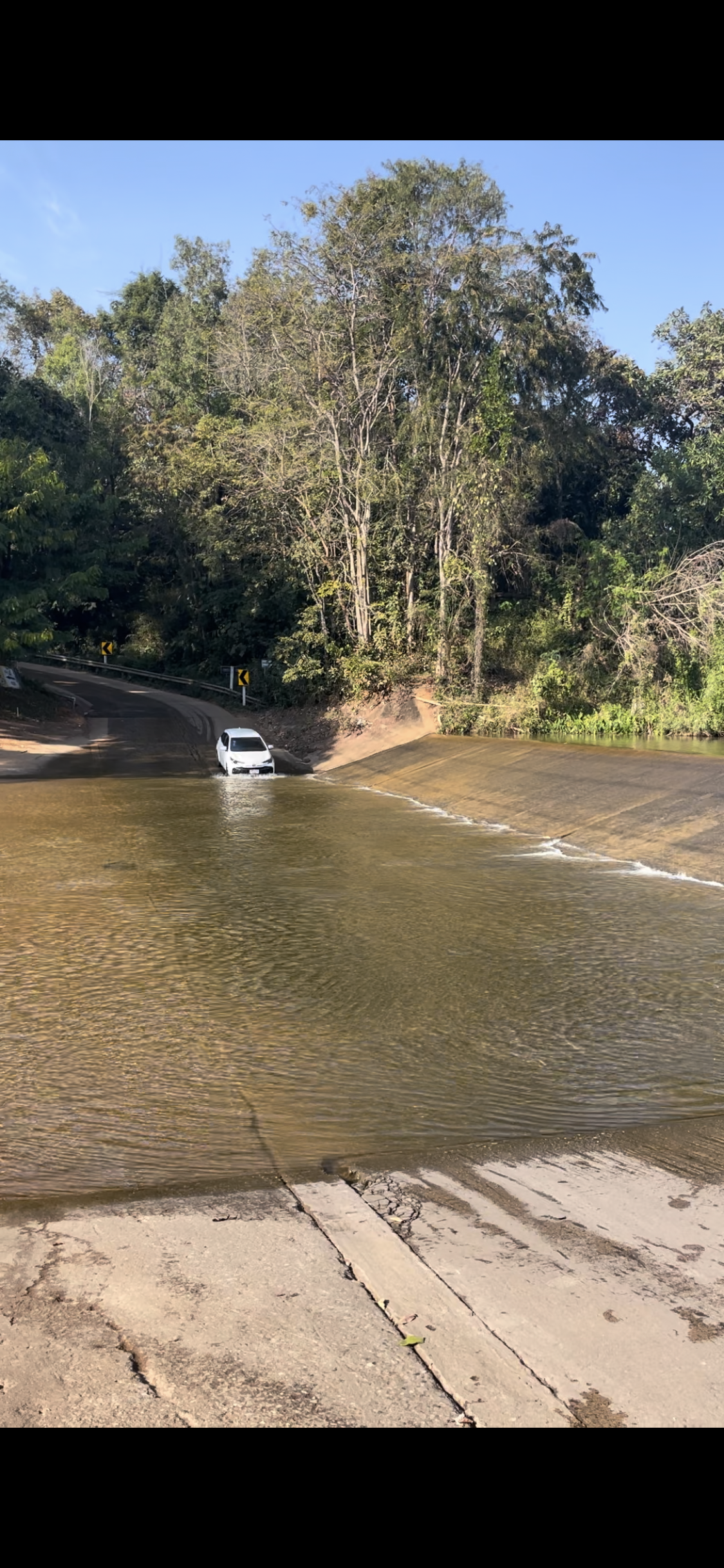 An diesem Tag haben wir Chiang Rai schon wieder verlassen und sind ganz in den Nordosten Thailands gefahren. Doch zuerst waren wir in einem kleinen Bergdorf im Westen von Chiang Rai. Der Hinweg war größtenteils unspektakulär, bis vor uns auf einmal ein Hindernis war. Die Straße ging ein winziges Stückchen steil bergab, dann etwa 30 Meter geradeaus, danach wieder steil bergauf und verlief dann wieder normal. Allein das wäre ja nicht so ungewöhnlich. Nur war rechts von uns ein großer Stausee, links von uns ein kleiner Fluss… und das Wasser floss mitten über unsere Straße! Wir haben erstmal ein anderes Auto beobachtet, was dieses Hindernis ohne zu Zögern überwunden hat. Daraufhin haben wir uns dem angeschlossen und ich habe unser Auto durch das etwa schenkeltiefe Wasser gelenkt. Es war deutlich weniger episch, als es jetzt klingt, ich habe überhaupt nichts von dem Wasser bemerkt.
