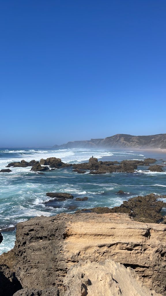 Sagres ist der südwestlichste Punkt in ganz Europa. Nicht nur steht dort ein beeindruckendes Fort, auch sind die Strände und angrenzenden Klippen dort unfassbar beeindruckend. In Sagres selbst bin ich auf ebendiesen Klippen eine Weile gewandert und habe mich umgesehen, bevor ich weiter an einen nahegelegenen Strand an der Ostküste gefahren bin. Und wie ich herausgefunden habe, werden die Strände dort nicht ohne Grund das „Paradies für Surfer“ genannt. Die Wellen waren beeindruckend, denn zwischen dem Punkt, an dem die Wellen brechen und dem Punkt, bis zu dem das Wasser den Strand hoch kommt, lagen gut 30-50 Meter, je nach Größe der Welle. Dazu war der Strand ewig lang und bot einige Möglichkeiten, auf die Felsen im Wasser zu klettern.