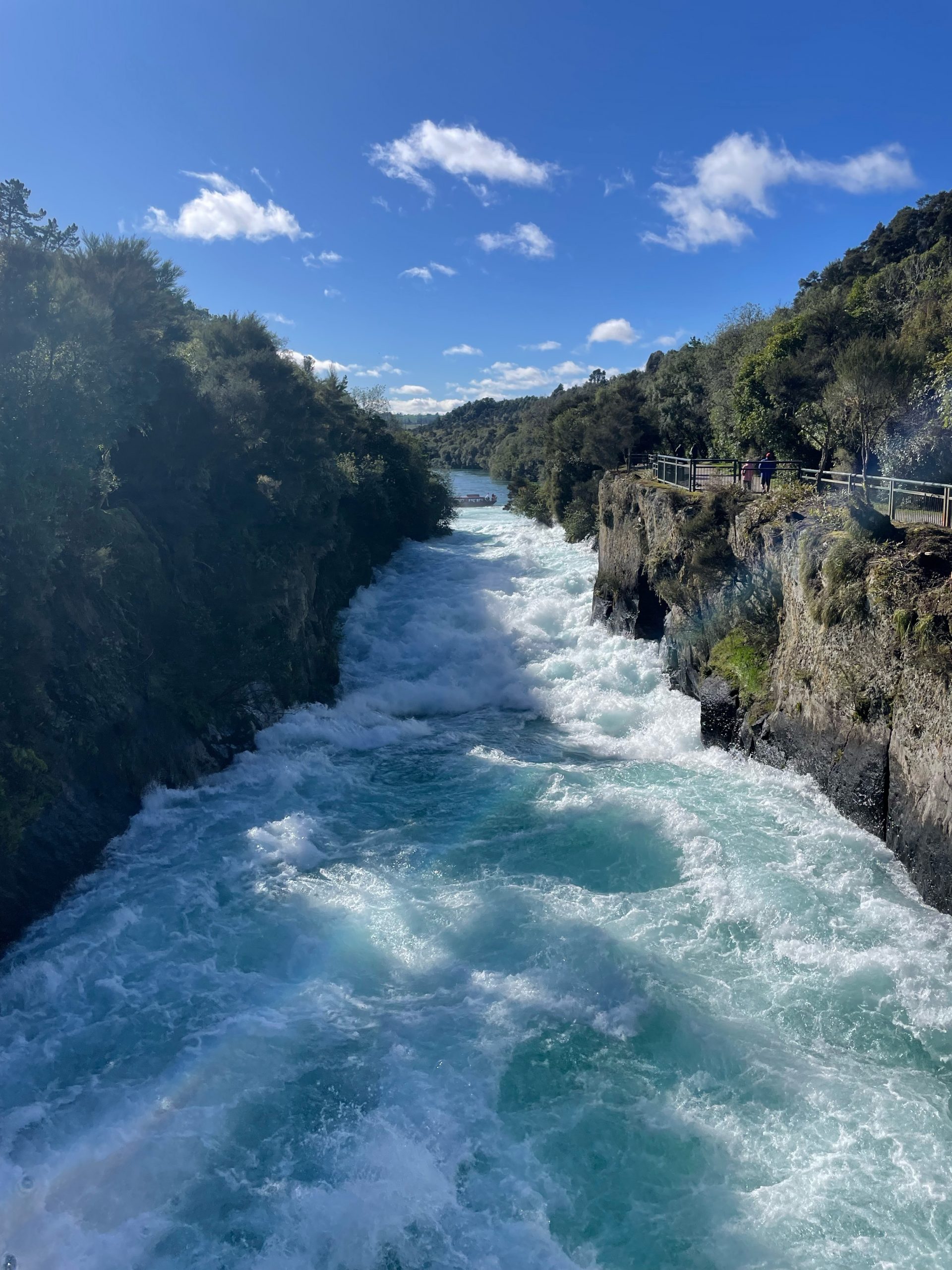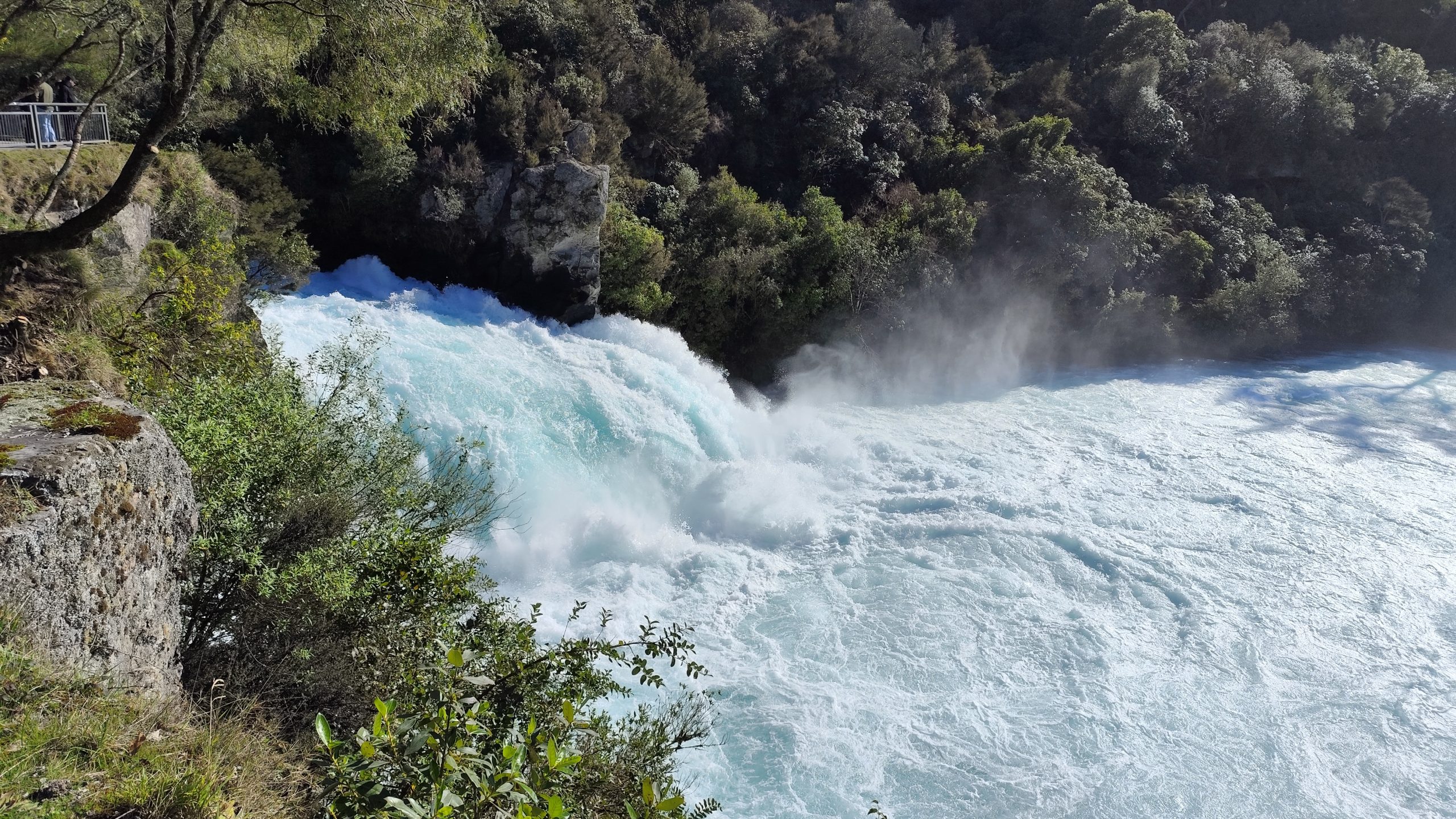 Neben dieser kleineren Attraktion waren die „Huka Falls“ mein absoluter Lieblingsort in Taupō! Die Falls entstehen an einer Stelle, an der der „Waikato River“, der durch Taupō fließt, durch eine besonders Enge Passage fließen muss. Vor und nach den Huka Falls fließt der Fluss als sehr breiter und nicht allzu reißender Strom aus der Stadt hinaus. An dieser Engstelle jedoch ist das Wasser richtig tosend und fällt am Ende sogar in einem kleinen, aber sehr reißenden Wasserfall hinab. Dazu ist die Farbe des Wassers dort richtig unwirklich und leuchtet bei Sonnenschein geradezu in einem leuchtenden Türkis.