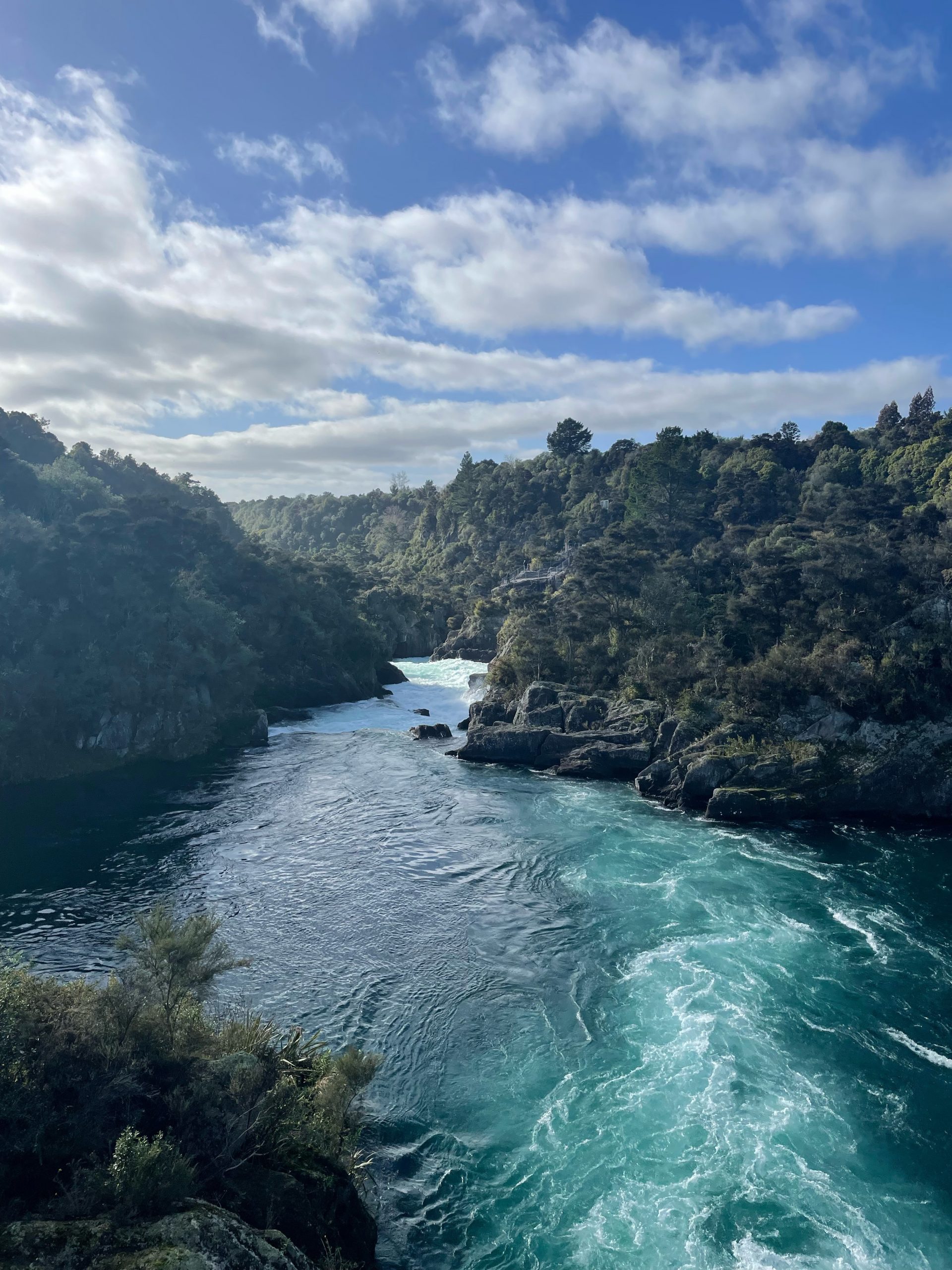 Über diese stürmischen Stromschnellen führt eine Brücke auf die andere Seite des reißenden Flusses und dort haben sich zu jeder Tageszeit immer viele Touristen gesammelt, die sich die Huka Falls angucken wollten. Wir selbst waren mehrmals dort, weil es zu beiden Seiten viele große und kleine Wander-/Laufwege gibt, die an dem Fluss entlangführten. Leider sind die Wege auch zum für Mountainbiker gedacht, weshalb es viel bergauf und bergab ging. Die 10km am Fluss hoch und runter zu laufen war dementsprechend ziemlich anstrengend. Auf dem Weg sind mir tatsächlich auch mehrere Menschen auf ihren Mountainbikes entgegengekommen. Hier in Neuseeland wird das Fahrrad fahren nur selten als Transportmittel und dafür viel als Hobby betrachtet. In ganz Neuseeland gibt super viele Bike-Tracks wie hier neben den Huka Falls und in den allermeisten Städten gibt es auch sehr gut besuchte Skateparks.