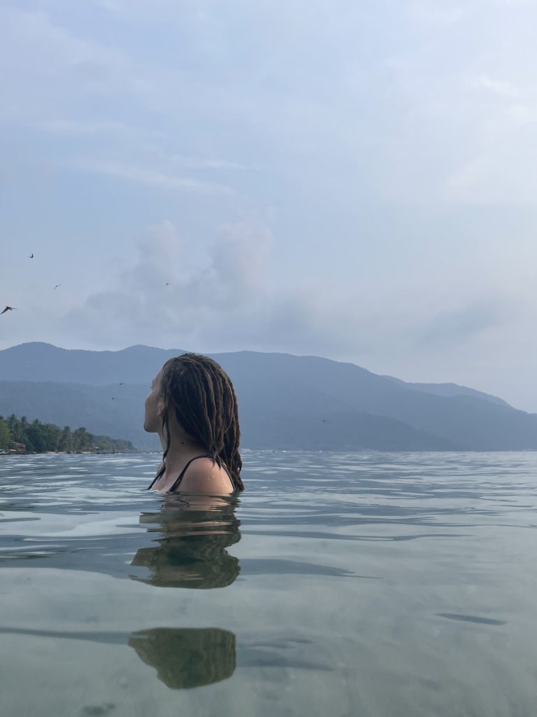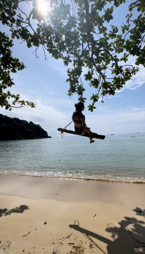 Trotzdem schafften wir es nach einer weiteren halben Stunde Wandern, an den Strand von Monkey Bay zu kommen. Auch hier gab es keine Chance auf Essen, denn der Strand war genauso leer wie der letzte. Also haben wir uns dazu entschieden, die Mittagshitze an diesem Strand zu verbringen. Ähnlich wie der letzte hätte unsere Aussicht wieder das Motiv einer Postkarte sein können. Nachdem wir uns beide etwas von der Sonne erholt hatten, war unser nächster Stop die Schaukel, die an einer der Strandpalmen befestigt war. Ein Ort wie aus dem Reiseführer.