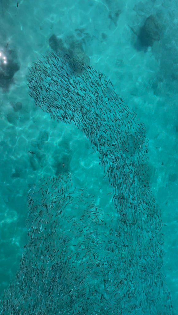 Der zweite Stop war für mich persönlich der herausforderndste. Hier war das Wasser mit Abstand am tiefsten, so um die zehn Meter rum. Für mich also eigentlich ein absoluter Albtraum, irgendwie habe ich mich aber trotzdem überreden lassen, ins Wasser zu springen. Das Boot lag vor einem großen Felsen, der aus dem Wasser ragte, ungefähr hundert Meter von der Insel entfernt. In der Zeit, die wir vor Ort hatten, sind wir an dem Felsen vorbei auf die andere Seite geschwommen, sodass wir das Boot nicht mehr sehen konnte. Die ganze Umgebung und Situation war auf jeden Fall beängstigend, aber den Aufwand absolut wert! Die Wellen von Unterwasser an den Felsen zerschlagen zu sehen, während die Fische um einen herum schwammen war einfach nur beeindruckend. Von dieser Location sind auch meine Lieblingsvideos vom Schnorcheln entstanden.