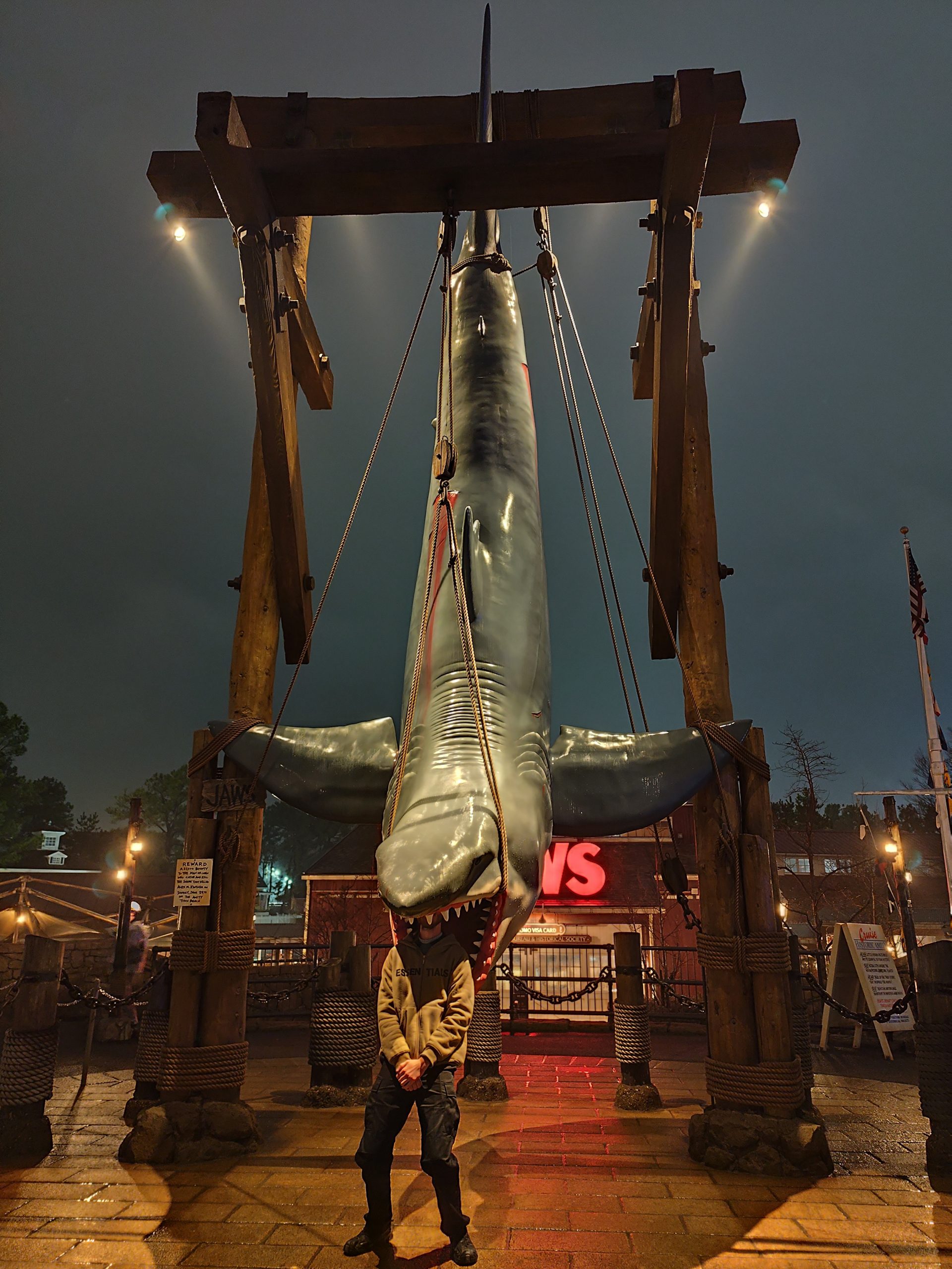 Als nächstes Stand eine Wasserbahn zum Thema „The Jaw“ an. Ich habe den Film über diesen riesigen Hai nie gesehen, aber es hat trotzdem viel Spaß gemacht. Am Anfang des Eingangsbereich hängt ein lebensgroßer Hai an seiner Flosse und dem Maul aufgehängt. Und auch im Wartebereich war alles wieder ganz dem Thema gewidmet: Fischernetze, Karten, Kompasse, Meerestiere und vieles Meer. Nach einer halben Stunde warten sind wir endlich in das große Boot eingestiegen. Von der Fahrt selbst haben Thies und ich nur die Hälfte mitbekommen, weil die Kapitänin eine Geschichte erzählt hat, natürlich auf Japanisch. Das war aber gar nicht so schlimm, es gab auch genug zum Angucken! An verschiedenen Stellen sind große Hai-Attrappen aufgetaucht, haben das Wasser in Aufruhr gebracht oder sogar angezündet. Einmal habe ich mich richtig erschreckt, als der Hai plötzlich lautstark hinter mit aufgetaucht ist und mit seinem riesigen Maul unserem kleinen Boot erstaunlich nahe gekommen ist. Zum Glück saß Thies noch zwischen mir und dem großen Fisch, denn so hat er das ganze Spritzwasser abbekommen und ich bin trocken geblieben, sehr praktisch! Am Ende wurde das Untier natürlich erlegt und wir sind sicher wieder am Steg angekommen.