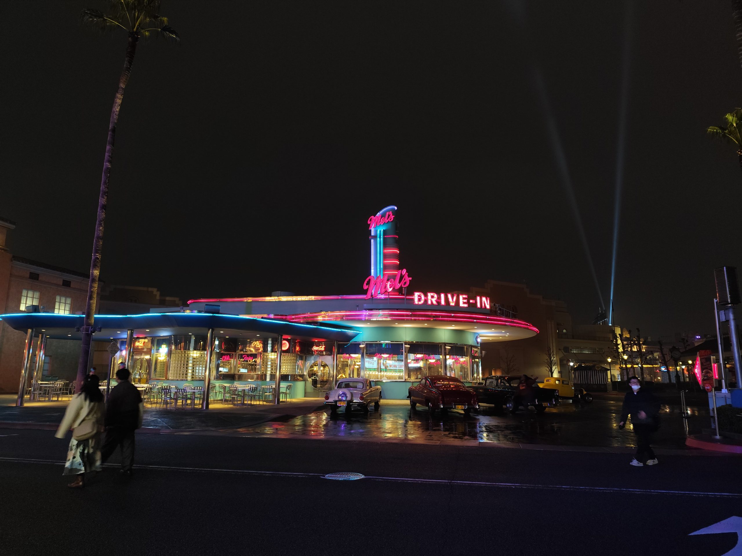 Dann wollten wir die letzten 20 Minuten der Öffnungszeit nochmal nutzen, um die Hollywood-Welt zu besuchen. Wir haben uns dort noch überhaupt nicht umgesehen und das wollten wir noch kurz nachholen. Um dorthin zu gelangen hat Jennie uns an den Bahnen von Jurassic Park vorbeigeführt. Vor der großen Bahn (Flying Dinosaur) standen immer noch zwei Aufpasser. Wir haben zwar fest mit einer Absage gerechnet, aber wir wurden wider jeder Erwartung nochmal hineingelassen. Wir konnten unser Glück kaum fassen, als wir in die zweite unverhoffte Bahn eingestiegen sind. Wieder mussten wir kaum warten und sind mit der vorletzten Runde des Tages gefahren. Im Dunkeln war es richtig schön über dem leuchtenden und glitzernden Tag zu Schweben, auch wenn man dies nur am Anfang der Fahrt wirklich genießen konnte. Später ging es zu schnell hoch, runter und im Kreis, um einen Ort fest im Blick behalten zu können.