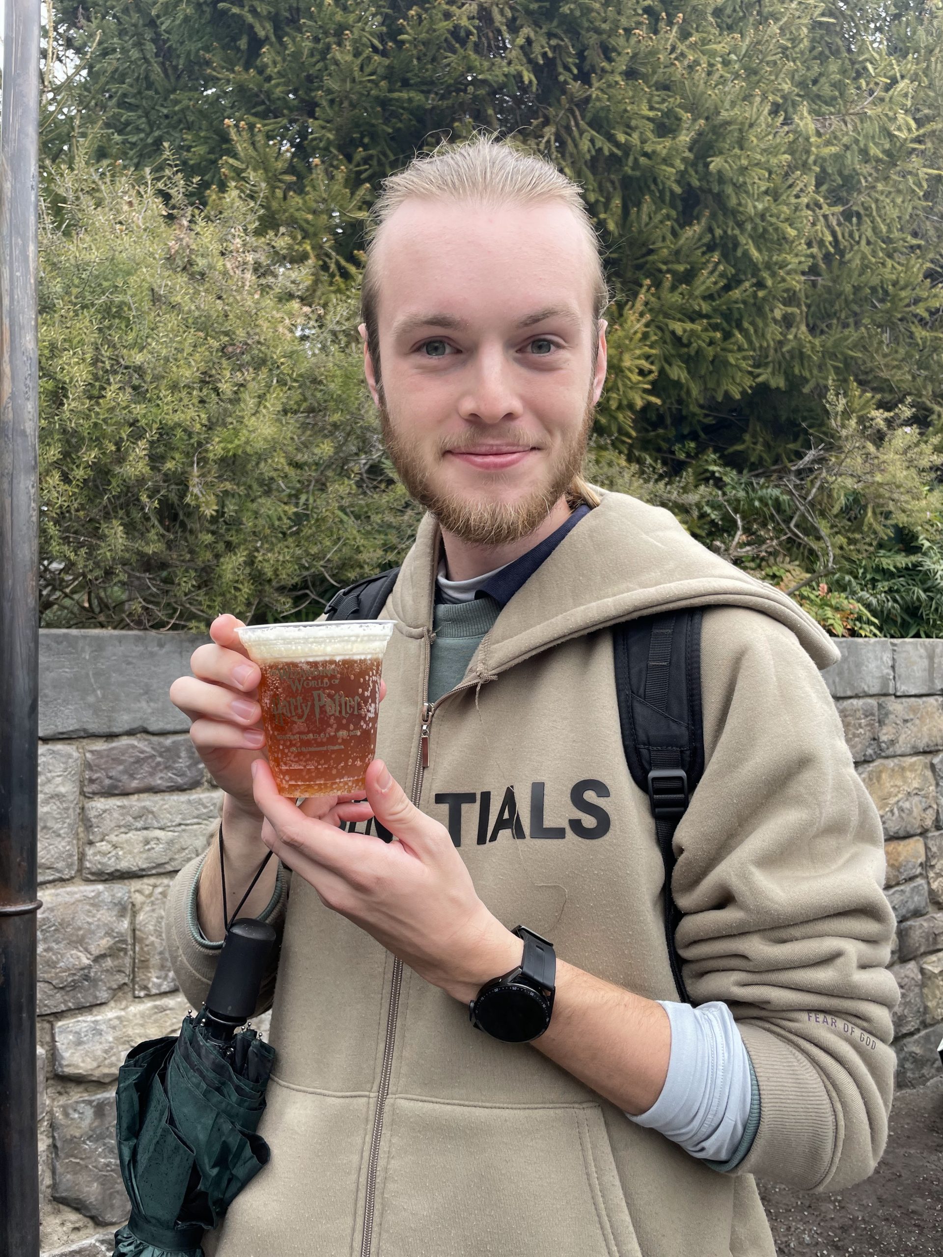 Wir sind zuerst einfach nach hinten gekippt. Die Achterbahn war nur drinnen und war zugleich eine kleine Kino-Erfahrung. Wir sind an einem großen Bildschirm vorbeigeflogen, auf dem sich das Bild mit uns mit bewegt hat. So konnten wir den Szenen problemlos folgen. Aber es gab auch echte nachgebaute Objekte. Und so wurden wir, halb digital, halb echt, in eine Welt der Magie mitgenommen. Wir sind mit Harry über das Schloss Hogwarts geflogen, sind vor einem Drachen geflohen, wurden von der Spinne Aragog erschreckt, haben bei einem Quidditch-Spiel mitgemacht, haben Dementoren verjagt, wurden fast von einer (echt nachgebauten) peitschenden Weide getroffen und wurden am Ende von allen Schülern und Lehrern gefeiert. Dabei sind wir immer wieder plötzlich gefallen, hochgeflogen oder in unvorhersehbare Richtungen weggekippt. Diese Mischung aus „echten“ Szenen, wie der spuckenden Spinne, einem Feuer speienden Drachen oder den Dementoren und digitalen Passagen wie dem Quidditch-Spiel, dem Flug über Hogwarts oder all den Lehrern und Schülern haben diese Bahn für mich einzigartig gemacht. So etwas habe ich vorher noch nie erlebt! Als Harry-Potter-Fan war das für mich nochmal doppelt besonders und unerwartet emotional. Eine wirklich tolle Achterbahn und doch war die Harry-Potter Welt ja erst der Anfang des Parks! Doch bevor es weiterging haben wir uns erstmal ein Butterbier geteilt. Die süße Brause mit Sahne hat einerseits sehr befremdlich geschmeckt, aber es war auch irgendwie gut. Man könnte auch sagen: zauberhaft!