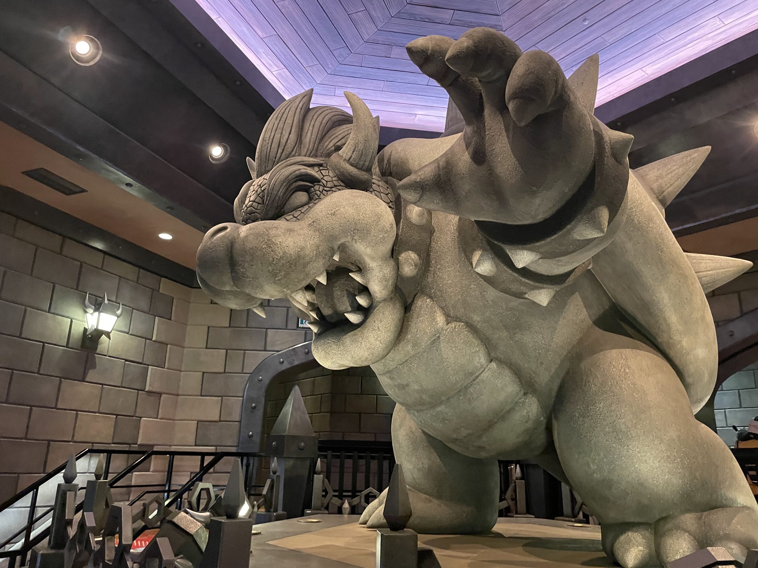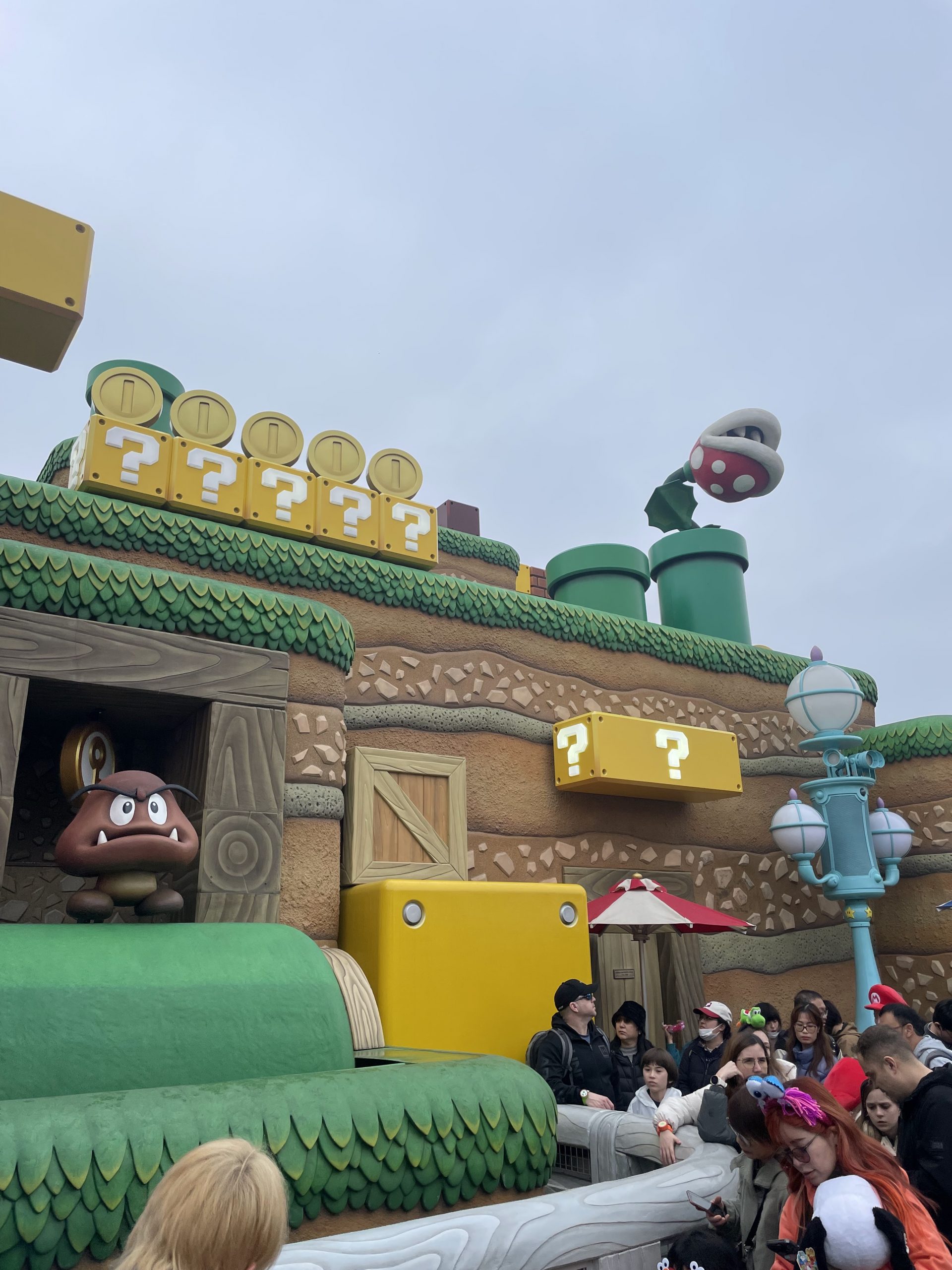 Eins der großartigen Details an diesem Freizeitpark war, dass die Themenwelten klar voneinander abgetrennt waren. So ist man nicht von Hogsmeade aus direkt zu Mario gekommen, sondern musste zuerst durch den verbotenen Wald laufen, welcher zu einer Straße führte und durfte dort in einen Tunnel abbiegen – oder sagen wir eine Röhre. Denn dort begann die Thematik schon, wir wurden sozusagen geschrumpft. Der Beginn der Röhre sah noch aus, wie ein normaler Tunnel, doch als wir den Ausgang erreichten, wurden wir begrüßt von Meterhohen Koopas, den fleischfressenden Pflanzen und riesigen Goldmünzen, die über Lucky Blocks schwebten. Alles was man aus einer typischen 2D Mario-Welt kannte, war dort und bewegte sich. Vor uns lag nun Bowsers Schloss, umgeben von Minispielen und thematisch passenden Spielfiguren in Lebensgröße.