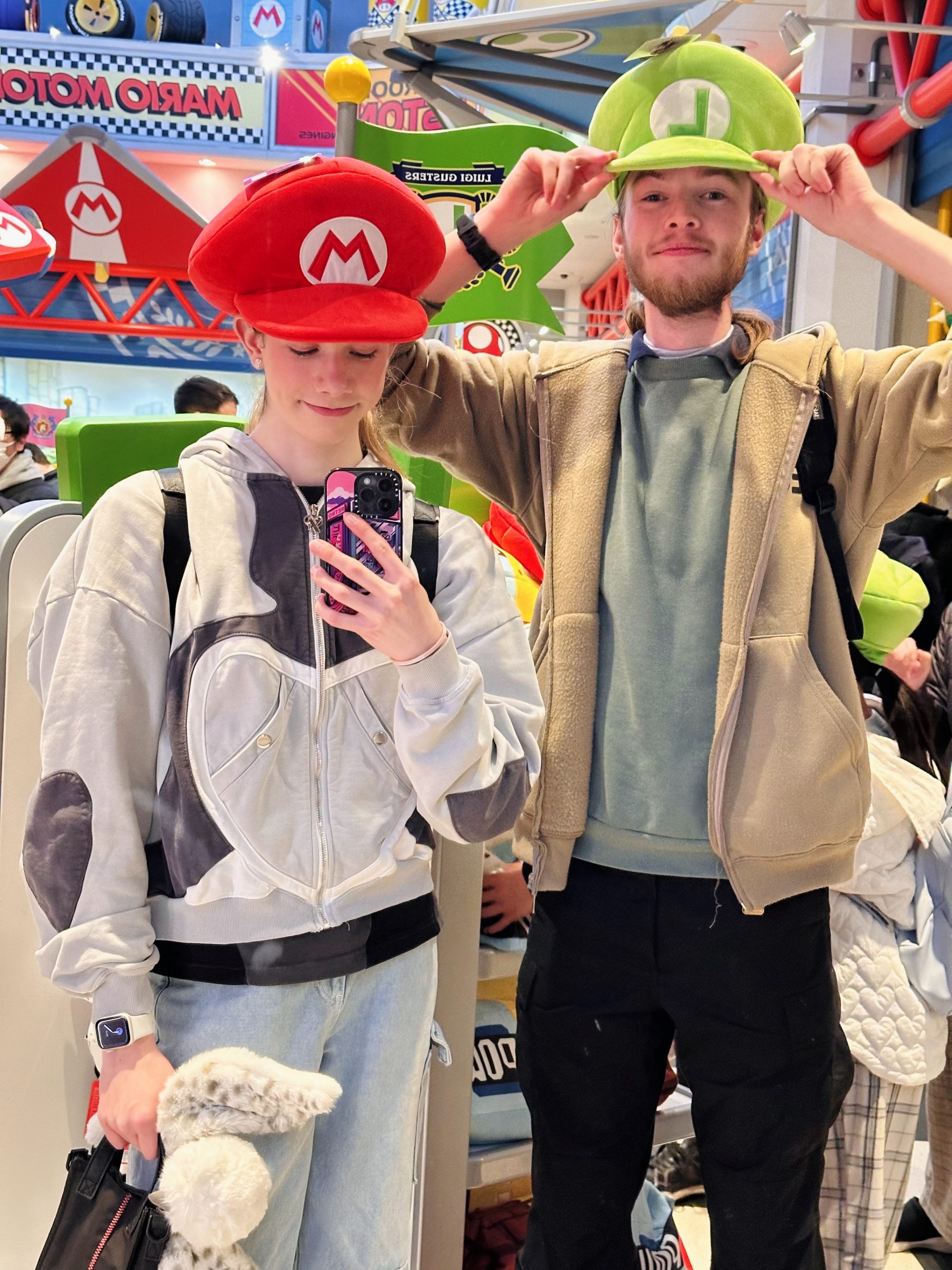 Nach dieser etwas ruhigeren Achterbahn führte der Weg Richtung Ausgang uns natürlich noch durch einen Shop – was auch sonst. Doch ausnahmsweise habe ich mir tatsächlich etwas gekauft, was ich auf dieser Reise eigentlich eher selten kann. Ich bin jetzt im Besitz einer echten Mario-Mütze! Jennie hat sich auch eine Mario-Mütze gekauft, wir passten mit den Mützen also perfekt zusammen.