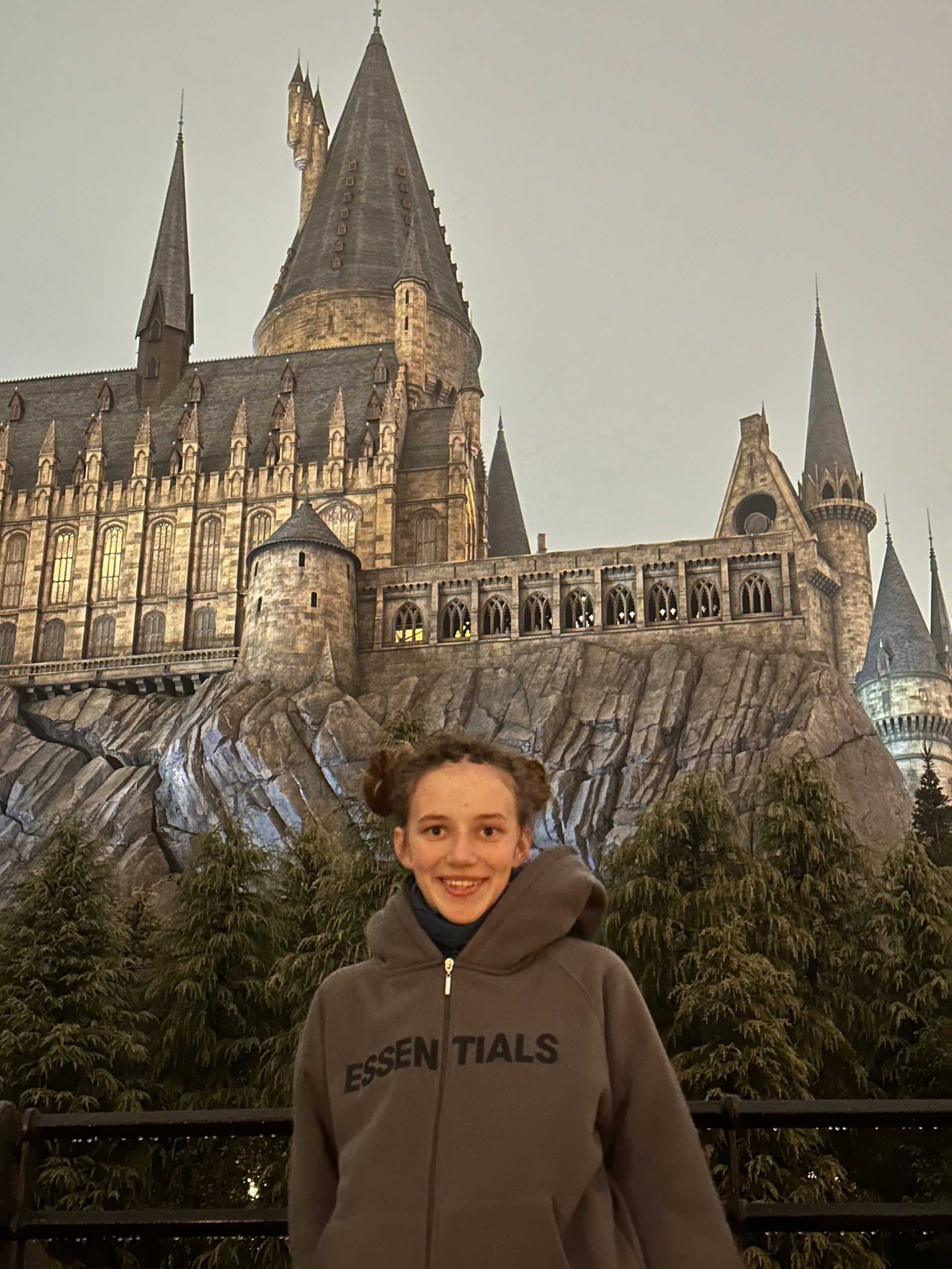 Nachdem die Fahrt zu Ende war, sind wir ein Stück weiter gelaufen. Denn zur Harry Potter Welt gehörte auch die Nachbildung des Hogwarts-Schlosses. Es war zwar kleiner als im „Original“, aber trotzdem groß genug, dass es ein echtes Schloss sein könnte! In diesem Schloss befand sich die zweite zauberhafte Achterbahn. Schon das Anstellen dafür hat Spaß gemacht, denn die Schlange bewegte sich durch die Gewächshäuser am Schloss vorbei und schließlich durch die Kerker ins Innere. Am Rand gab es verschiedene Klassenzimmer und auch den Spiegel „Nerhegeb“ haben wir entdeckt. Nachdem wir alle unsere Wertgegenstände und anderen Kleinkram, der während der Fahrt wegfliegen könnte, in Schließfächern verstaut hatten, ging es weiter. Wir sind durch verschiedene Klassenzimmer, ein Treppenhaus mit sprechenden Gemälden und eine große Halle mit dem sprechenden Hut gelaufen, bis wir endlich am Beginn der Achterbahn waren. Auf einem Laufband sind längs mehrere Wagons gefahren und wir haben uns in einen davon gesetzt. Dann begann die Bahn, die ich im Nachhinein zu meiner Lieblingsattraktion erklärt habe!