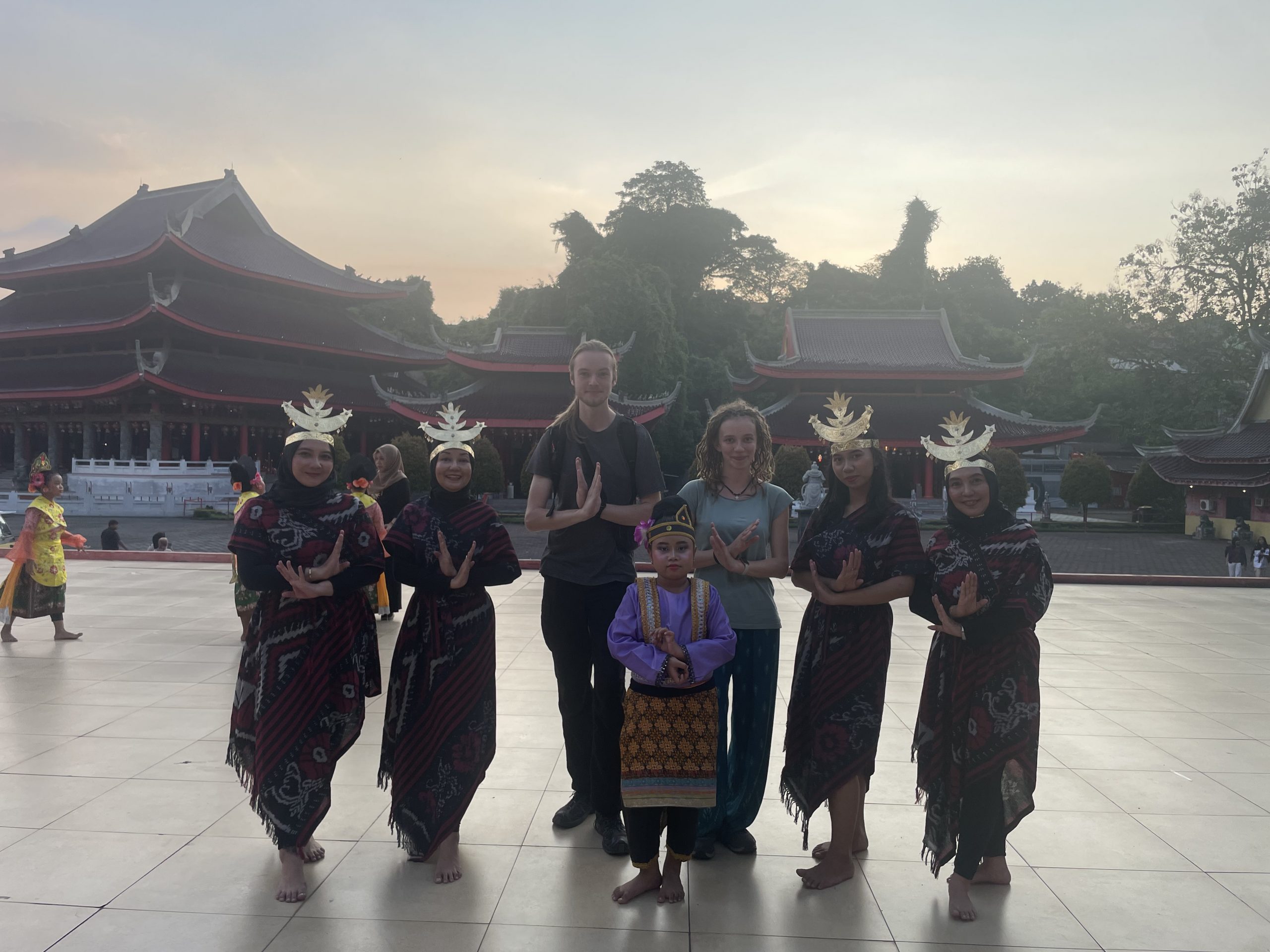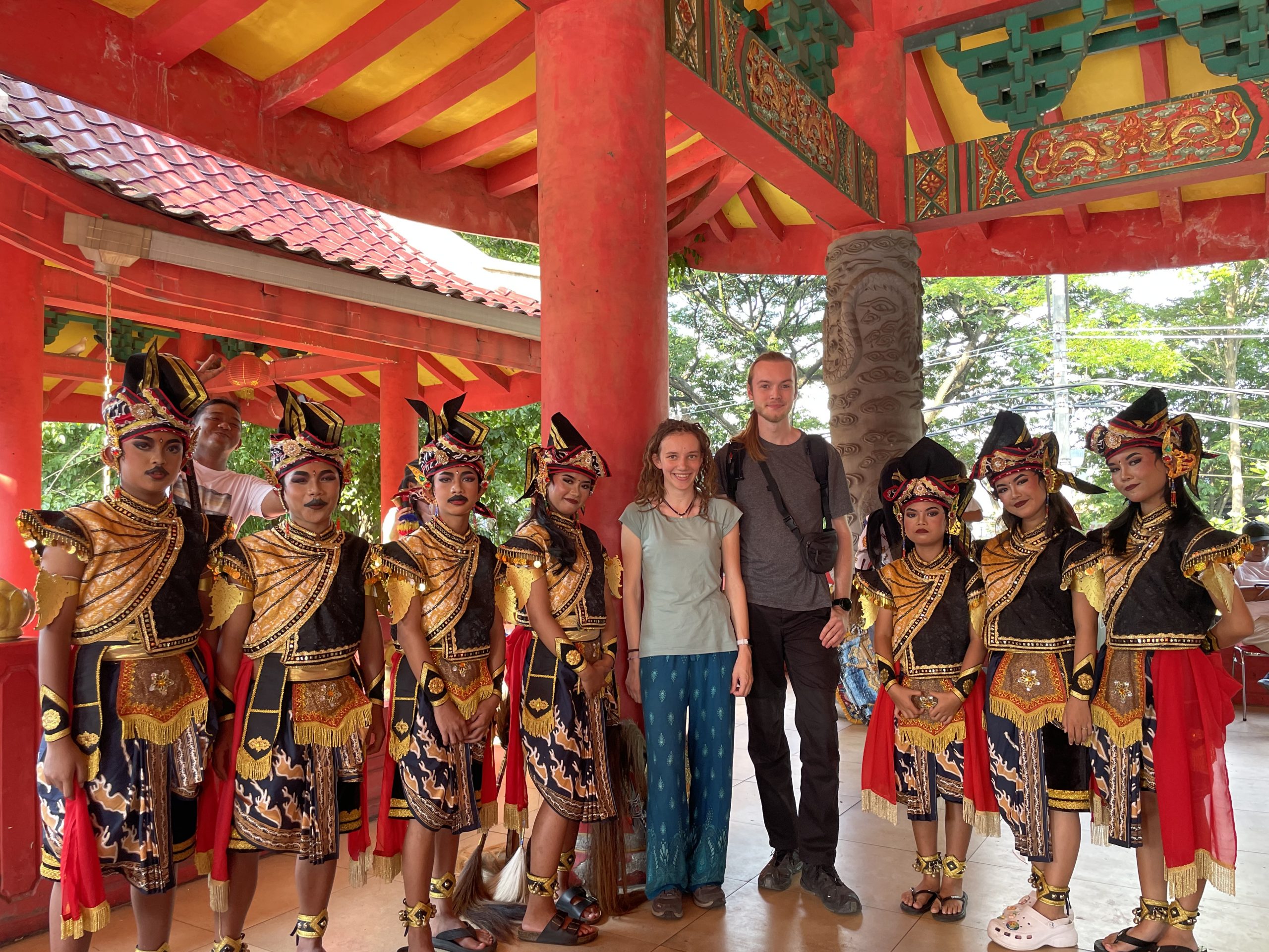 Schon bei der Ankunft auf dem großen Tempelgelände haben wir bemerkt, dass deutlich mehr los ist, als es bei anderen Tempelbesuchen der Fall war. Vor dem großen, roten Haupttempel waren viele Stände aufgebaut, die Essen und Getränke verkauft haben. Auf dem gesamten Gelände waren viel Menschen unterwegs, jedoch kaum Touristen. Semarang ist keine typische Stadt für Reisende, weshalb uns das kaum überrascht hat. Wir haben uns von den (wie immer) neugierig starrenden Blicken nicht irritieren lassen und sind die Treppenstufen zu dem Haupttempel empor gestiegen. Dort bot sich uns ein überraschender Anblick: Von einer Bühne am anderen Ende des Tempels tönte uns laute Musik entgegen, davor waren viele Stühle aufgereiht. Auf der Bühne tanzte eine Gruppe junger Erwachsener in bunten Kostümen zu der Musik. Aber auch im Zuschauerraum gab es viele Tanzgruppen unterschiedlichen Alters, die in verschiedenen Trachten und Kostümen gekleidet waren und oft bunter Schminke und aufwändigen Frisuren trugen. Ohne es zu ahnen waren wir in eine Vorstellung von unterschiedlichsten typisch-indonesischen Tänzen hineingestolpert!