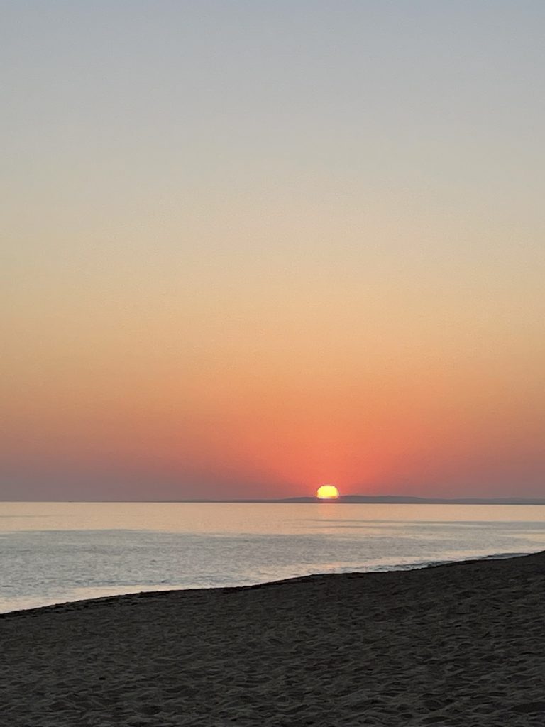 Der Sonnenuntergang am Strand war großartig. Keine einzige Wolke am Himmel, alles leuchtet Rot-orange und die Sonne zeigt sich durch den Nebel als großer, roter Feuerball.