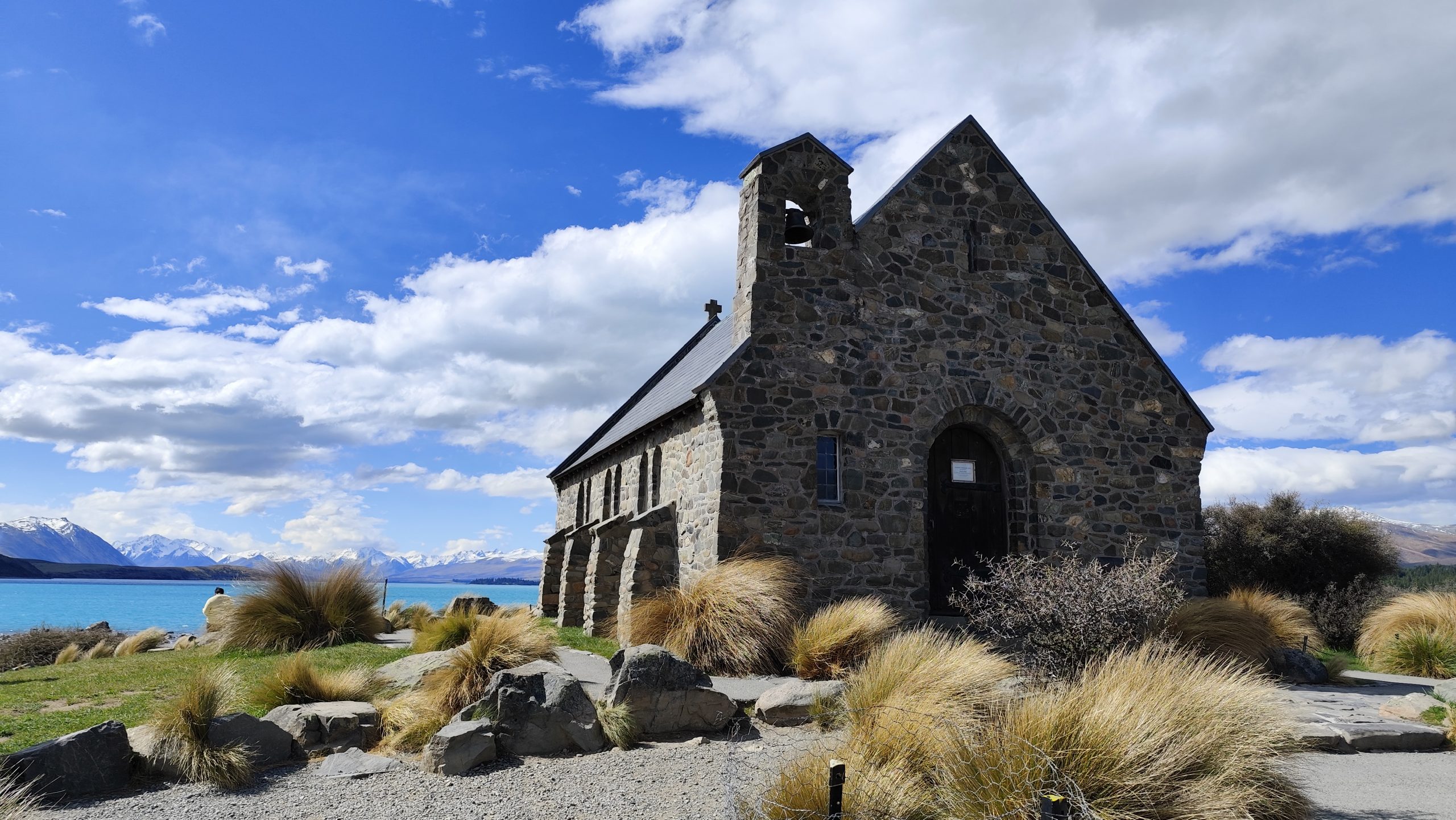 Nachdem wir uns ausreichend an all den Autos satt gesehen und an den Küchlein satt gegessen hatten, war es Zeit für uns in unser (nicht so teures) Nicht-Luxusauto zu steigen und in die nächste Stadt zu fahren. Wobei Stadt irreführend ist, denn das Highlight war nicht die Stadt Tekapo, sondern der namensgebende See. Der Gletschersee wird aus mehreren Flüssen gespeist, die aus der Bergkette entspringen, die die Südinsel von Norden nach Süden durchzieht. Diese trägt übrigens den Namen „Südliche Alpen“, nicht sonderlich kreativ von den Briten!