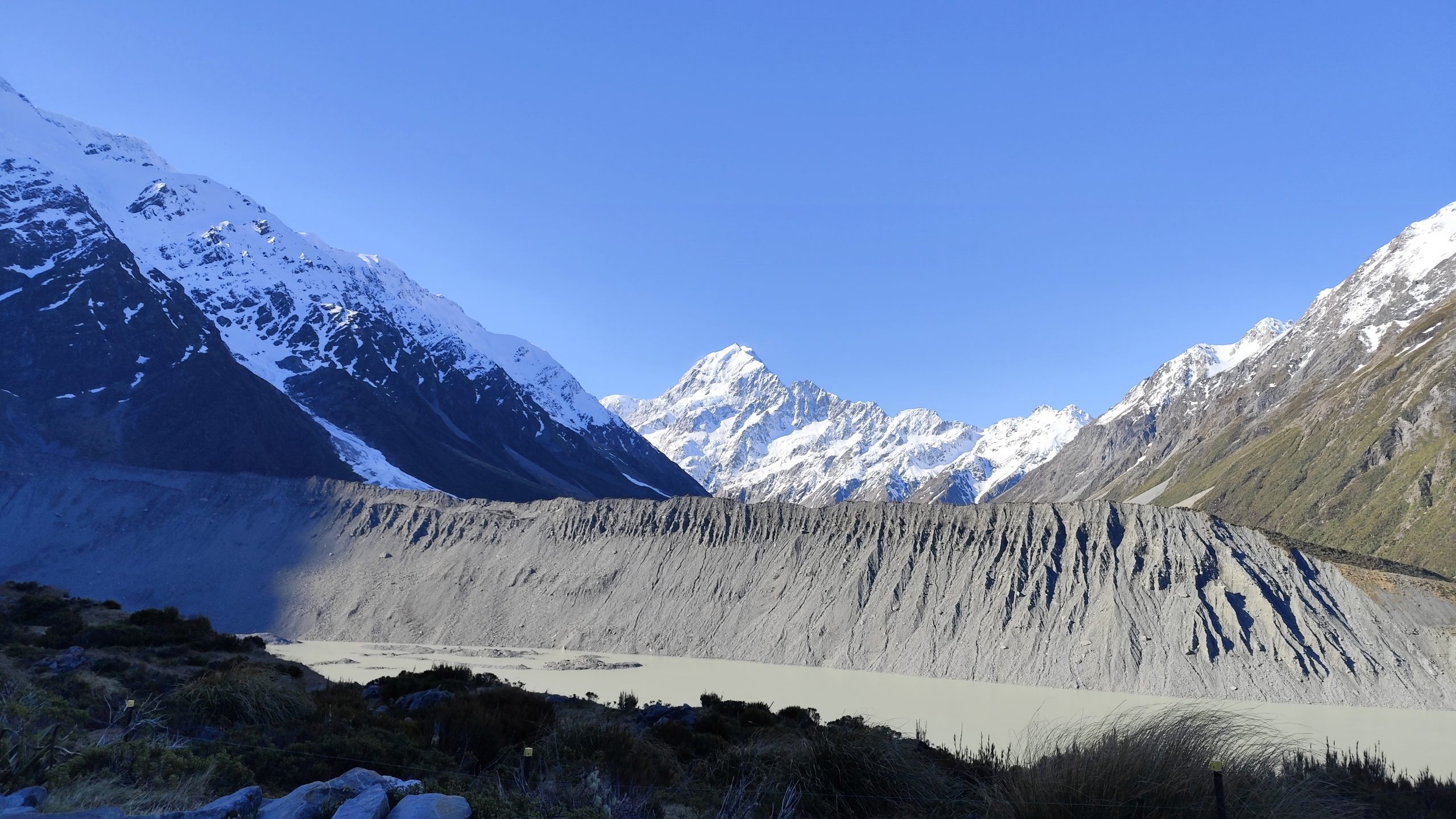 Trotzdem hatten wir danach noch genug Zeit für einen zweiten der Wanderwege – den Kea Point. Wer im letzten Artikel gut aufgepasst hat, der weiß, dass es sich dabei um eine Papageien Art handelt, die die Südinsel Neuseelands unsicher macht. Nach genau dieser Art wurde der Aussichtspunkt benannt, die bunten Vögel sind aber nicht die einzige Attraktion! Der steinige Wanderweg zu diesem Aussichtspunkt führte wie der erste Weg fast nur geradeaus und wir mussten nur wenige Höhenmeter überwinden. Nach etwa einer halben Stunde hatten wir das Ende erreicht und standen nun direkt vor dem Mount Sefton und konnten auch endlich die prägnante Form des Mount Cook ganz deutlich ein Stückchen dahinter sehen. Vor uns und dem Tal, was zum höchsten Berg führte, lag ein trüber grau-blauer See, der aus vielen kleinen Bächen des Mount Sefton gespeist wurde. Auf der anderen Seite des Sees ragte eine steile, abgebrochene Kante aus Erde und Sand mehrere Meter in die Höhe und oberhalb der Kante erstreckte sich ein langes Tal, was direkt zum Mount Cook führte. Theoretisch hätten wir auf dem Mount Sefton auch einen Gletscher sehen können, aber da er sich so weit oben befindet, war er für uns nicht von dem normalen Schnee zu unterscheiden.