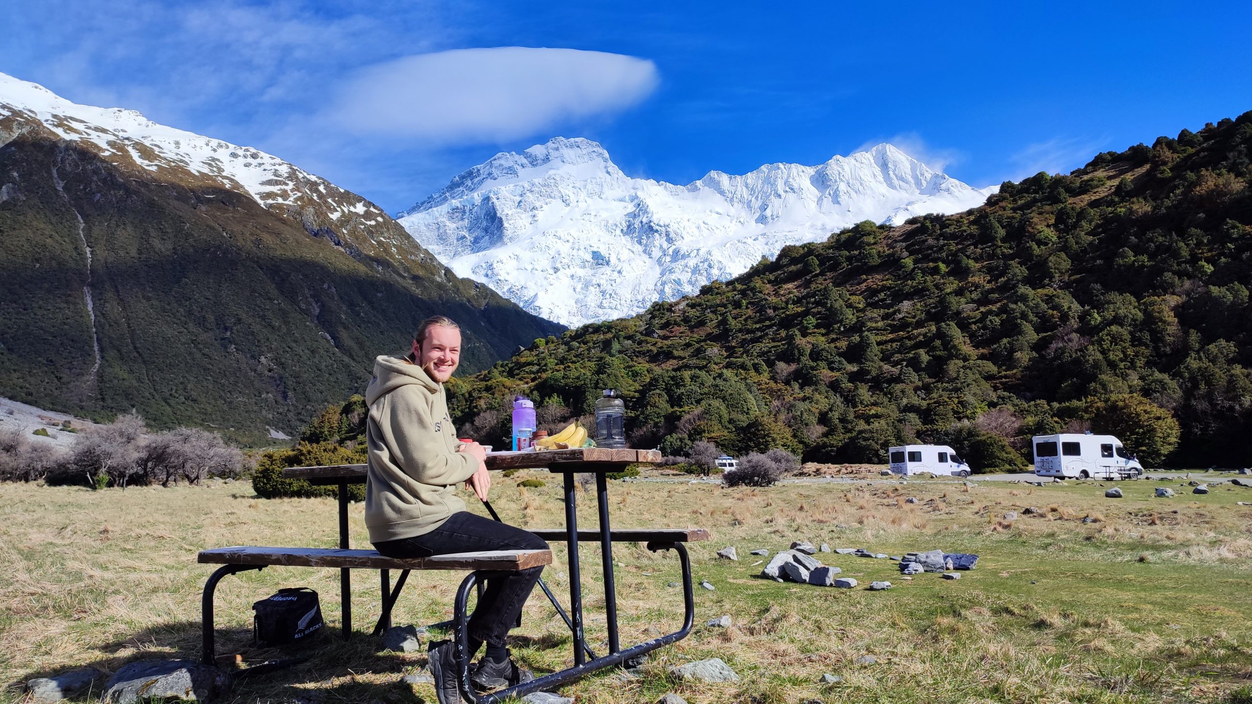 Irgendwann mussten wir diesen beeindruckenden Ort wieder verlassen, weil es im Schatten doch etwas kalt wurde. Gegen 18 Uhr haben wir uns also wieder auf den Rückweg gemacht und sind ein kleines Stück mit unserem Auto gefahren. Denn direkt neben dem Parkplatz befindet sich außerdem auch ein DOC-Campingplatz. DOC ist die Abkürzung für das Department of Conservation, was in Neuseeland für viele Campingplätze, Wanderwege, Berghütten und vieles mehr zuständig ist. Normalerweise versuchen wir ja nur auf kostenlosen Stellplätzen zu stehen, aber eine Nacht so nah bei den Bergen zu verbringen wollten wir uns nicht entgehen lassen. Vor allem nicht, weil wir sonst noch fast zwei Stunden zum nächsten kostenlosen Stellplatz hätten fahren müssen.