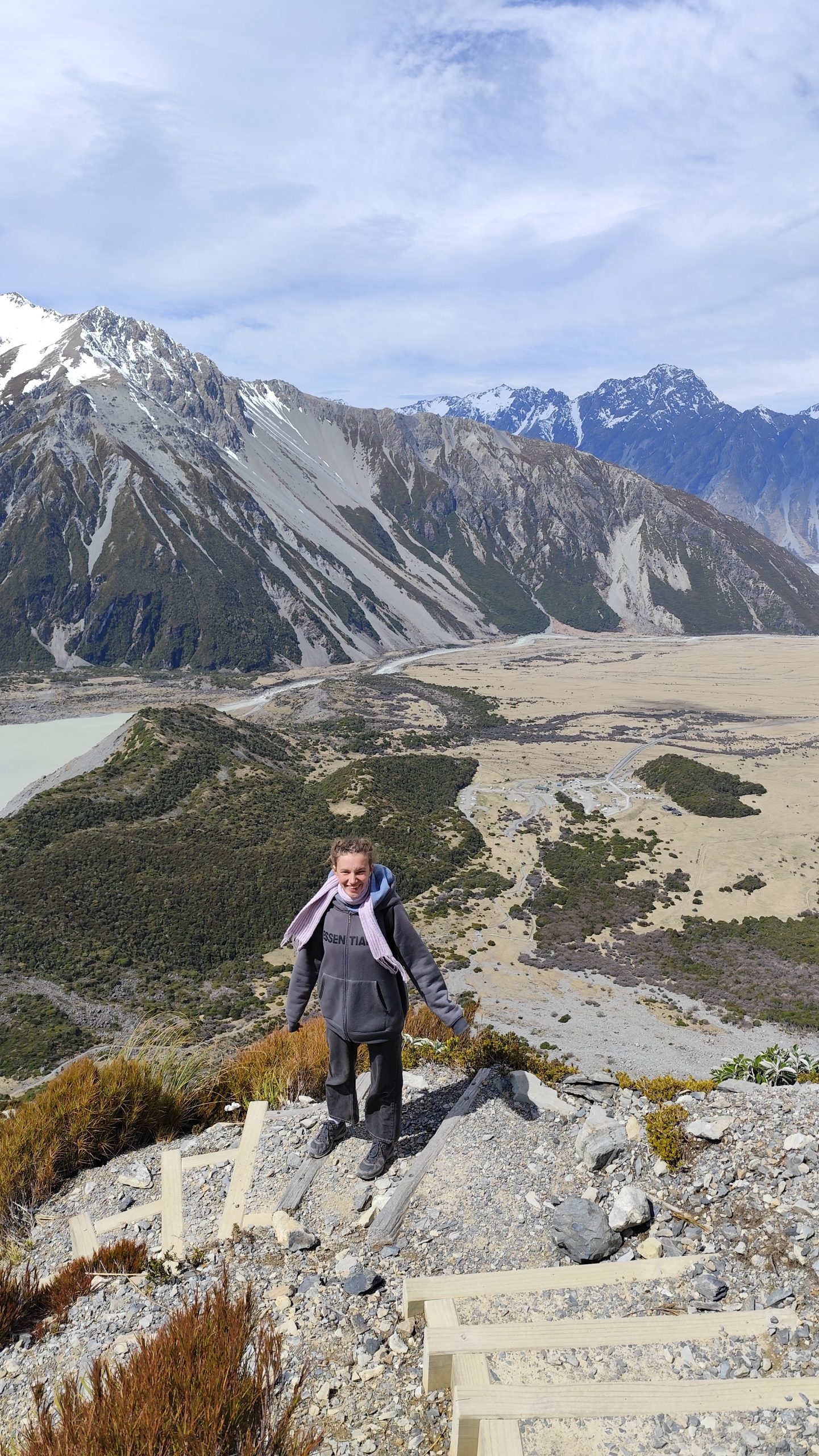 Schon auf dem ganzen Weg hatten wir immer einen tollen Blick auf die umliegenden Berge und auf den letzten paar Höhenmetern ist hier und da sogar noch Schnee auf unserem Weg dazu gekommen. Trotzdem war die Aussicht auf dem Weg nicht mit der Sicht vom Endpunkt zu vergleichen. Als ich am vorherigen Tag noch dachte der Kea-Punkt wäre beeindruckend, musste ich diese Aussage nun noch einmal überdenken. Der Sealy Tarns Point befindet sich nicht ganz oben auf einem Berg, dafür müsste man noch ein Stück weiter wandern, sondern auf einem kleinen Plateau, was sich mehrere hundert Meter über dem Kea Point befindet. Von beiden Aussichtspunkten blickt man grundsätzlich in die gleiche Richtung, mit dem Mount Sefton links und dem Mount Cook ein Stück dahinter zur Rechten. Aber nachdem wir die 2200 Treppenstufen überwunden hatten, konnten wir noch viel weiter in das Tal hineinblicken, was zu Fuße des Mount Cook lag. Nun konnten wir den Gletscher richtig erkennen, der vom Sefton ein Stück ins Tal hineinragte und auch einen weiteren See, der ganz tief hinten im Tal lag. Am besten guckt ihr euch einfach die Bilder an, es war unfassbar schön!