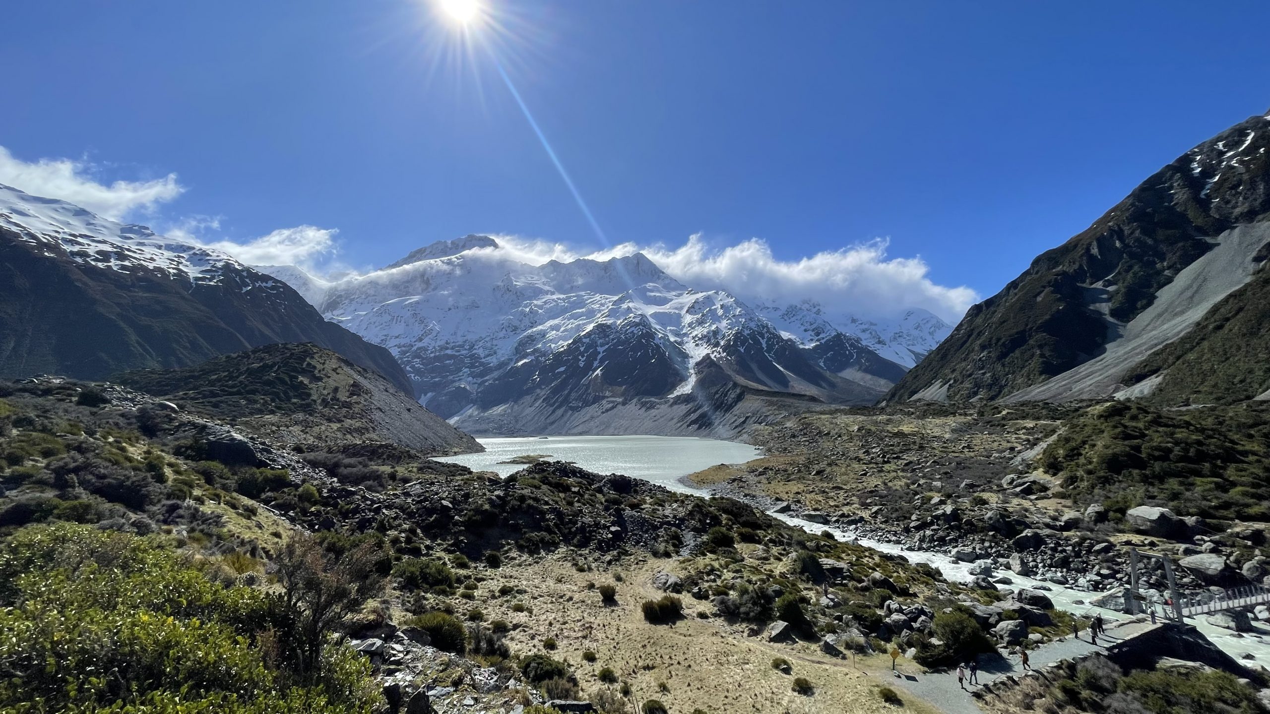 Dieser Parkplatz ist Ausgangspunkt für mehrere große und kleine Wanderungen, von denen wir uns direkt ein paar vorgenommen haben. Viele der Wege führen über einen der Gletscherflüsse, die deshalb von Hängebrücken überspannt werden. Leider wurden einige dieser Brücken durch heftige Regenfälle vor einigen Jahren instabil oder gänzlich unbegehbar, weshalb der bekannteste Wanderweg in dieser Gegend bei unserem Besuch noch gesperrt war. Wir sind trotzdem so weit gegangen, wie es möglich war und haben auch so ein paar tolle Aussichtspunkte sehen können. Ein Highlight dieser ist ohne Frage der Mount Cook bzw. Aoraki. Er ist mit 3.724 Metern nicht nur der höchste Gipfel in der Umgebung, sondern auch die höchste Erhebung Neuseelands. Dieser Berg hat dem Nationalpark auch seinen Namen gegeben, was er als höchster Berg durchaus verdient hat!